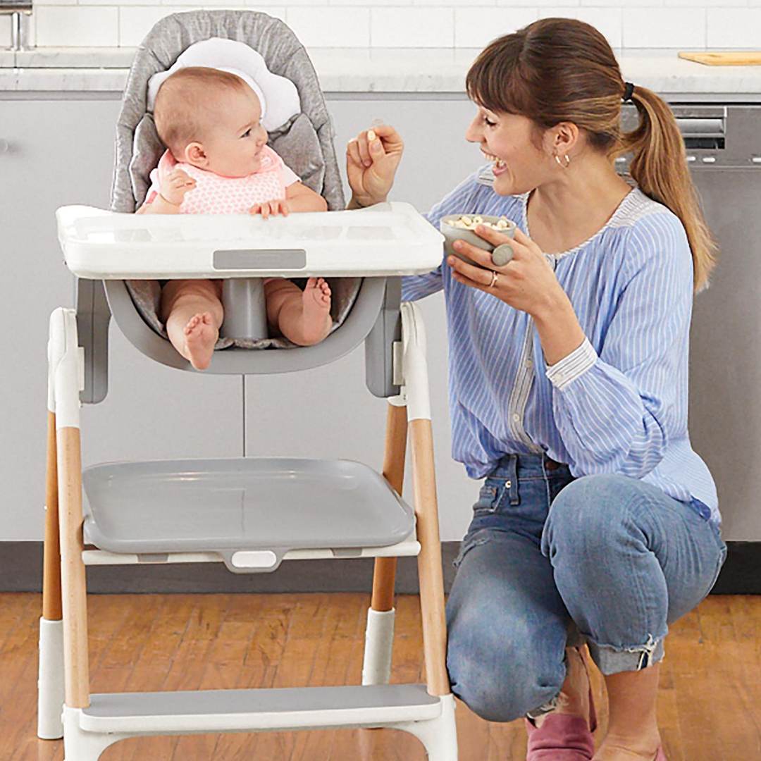 Carregada com recursos funcionais para tornar a hora das refeições mais fácil, nossa moderna cadeira alta pode ser puxada até a mesa para que o bebê faça parte das refeições em família. Além disso, ele se converte em um ajudante de cozinha para versatilidade crescer comigo. Materiais limpos, detalhes em madeira de faia e muito mais tornam esta cadeira para refeição que economiza espaço uma solução inteligente para pais e bebês.